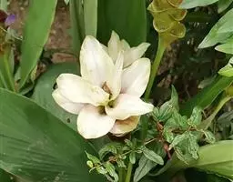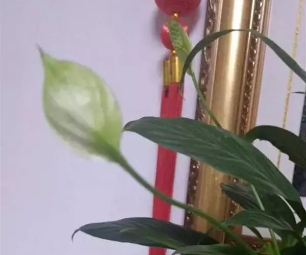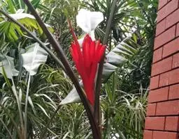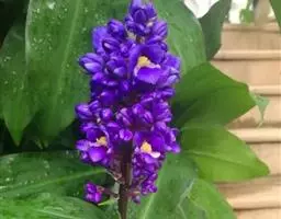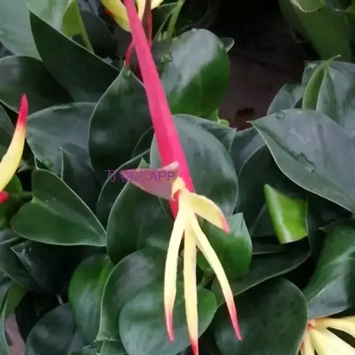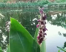 花数朵生于一约与叶柄等长或略短的总花梗上,下托一佛焰苞;佛焰苞舟状,长达20厘米,绿色,边紫红,萼片披针形,长7.5-10厘米,橙黄色,箭头状花瓣基部具耳状裂片,和萼片近等长,暗蓝色;雄蕊与花瓣等长;花药狭线形,花柱突出,柱头3。