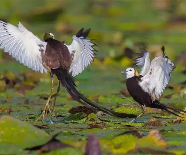 水雉生活在热带及亚热带的开放性湿地中,主要为淡水湖沼。因其有细长的脚爪,能轻步行走于睡莲、荷花、菱角、芡实等浮叶植物上,且体态优美,羽色艳丽,被美称为“凌波仙子”。