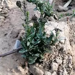 茎直立,中空,具肋棱,由上部分枝,分枝开展,被向下贴伏的柔毛。基生叶和茎下部叶长圆状披针形或披针形,长7-15厘米,宽2-4厘米,先端钝或渐尖,基部渐狭成柄,灰绿色,上下面均密生贴伏的短柔毛;茎中部及上部叶无柄,狄披针形,被灰色短柔毛。