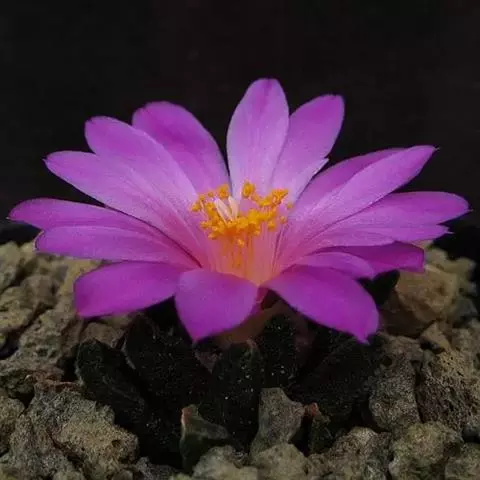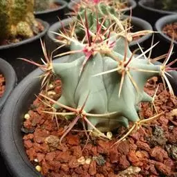 绯花玉 Speg.)是仙人掌科、裸萼球属多肉植物,植株呈扁球形,表皮墨绿色,刺针状,…