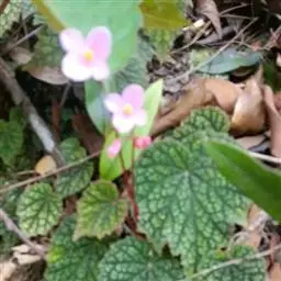 紫背天葵(学名:Begonia fimbristipula Hance):多年生小草本,高4-12厘米。块茎肉质,球形,无茎。基生叶通常1片;柄纤细,长2-6厘米,有长粗毛;叶片卵状心形,长2.5-7厘米,宽2-6厘米,先端渐尖,基部心形,近对称,边缘有不规则的尖锯齿,基出7-9条脉,两面有伏生粗毛,下面紫色。夏季开粉红色花,花单性同株,2-4朵花组成聚伞状花序,总花梗纤细,长超过叶片;雄花被片4,雄蕊多数;雌花被片3,子房下位,花柱3。蒴果三角形,有3翅,1翅特大,其他2翅条形。
