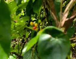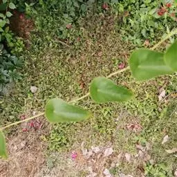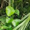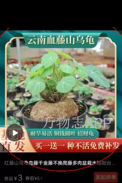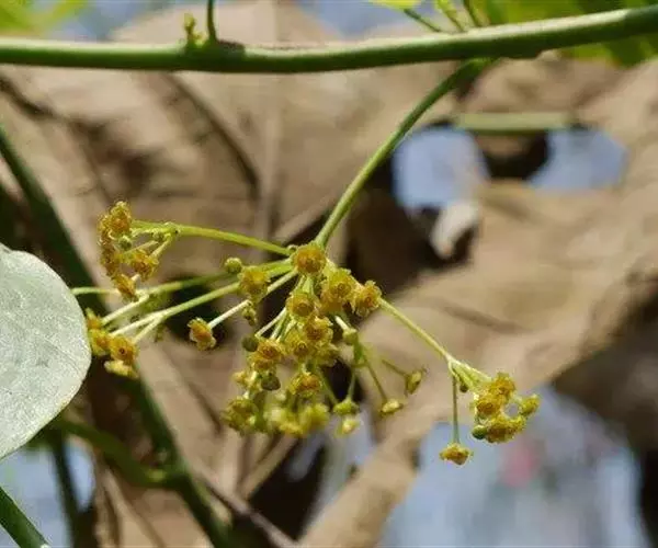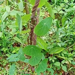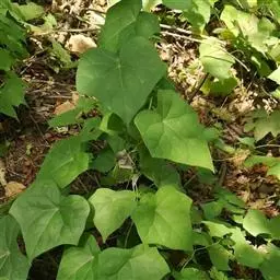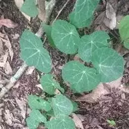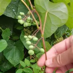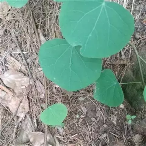 2、云南地不容:又名一滴血、红藤。多年生草质藤本,长2-3.5m。块根大。茎枝稍粗,枝、叶折断有紫红色汁液渗出。叶互生;叶柄与叶片近等长或较长;叶片三角状圆形或三角状扁圆形,长3.5-11.5cm,宽4-12.5cm,先端短尖或钝,基部近平截或微凹;掌状脉9-10条,网状脉稍明显,薄纸质。花小,单性,雌雄异株;雄株为复伞形聚伞序,总花序梗长3-6.5cm,纤细,伞梗8-10余个,长1-2cm,甚细;雄花:萼片6,具紫色斑纹,排成2轮,外轮倒披针形或倒卵形,长1.2-1.6mm,宽0.4-0.5mm,内轮有爪,上部瓣片近菱形,长2-2.2mm,宽达1.4mm;花瓣3,橙色具紫色条纹,阔楔形,长0.8-1.3mm,宽1.5-1.8mm,稍肉质,内面近中部有2个大腺体;雄蕊柱长0.8-1mm。雌株果序为复伞形,总果序梗长4-7cm,序梗稍纤细,伞梗多达10余个,长短不齐,长1-3cm。核果宽倒卵形,内果皮长5-6.5mm,背部有4行短柱状雕纹,先端膨大呈头状,每行15-17颗,胎座迹近正中穿孔。花期5-6月,果期6-9月。