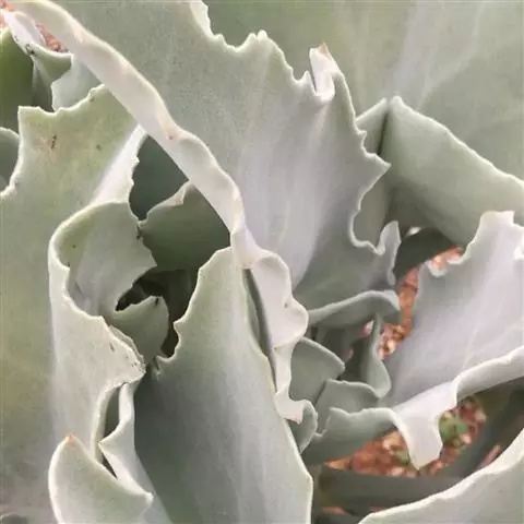 大瑞蝶茎部粗壮,会随着生长而逐渐伸长。叶片莲座型松散排列,株径可达15cm以上。叶片长圆形,有较尖的红色叶尖,叶缘光滑,叶片有点肥厚,叶面中间有凹槽。叶色蓝绿至蓝白色,新叶色蓝、老叶色绿,主要是白粉脱落了。强光与昼夜温差大或冬季低温期大瑞蝶叶色蓝白,弱光则叶色蓝绿。叶缘常会显现粉红色,温差大的时候红色更加明显。叶面上覆有白粉,老叶白粉掉落後呈光滑状。初夏开花,穗状花序长度可达30㎝以上,开橘色钟形花朵。