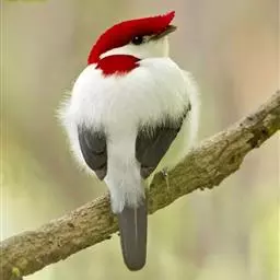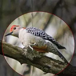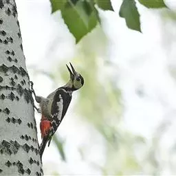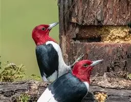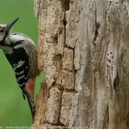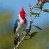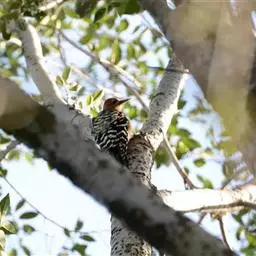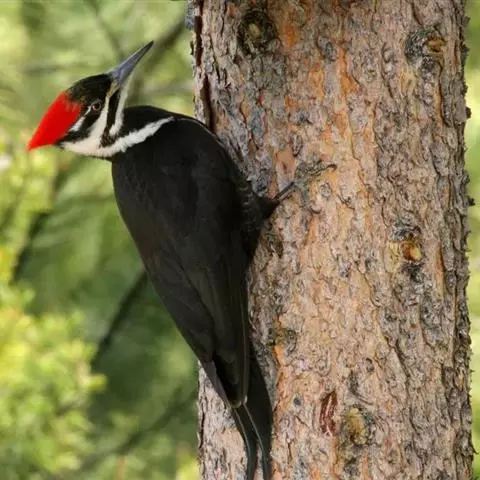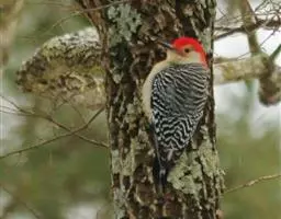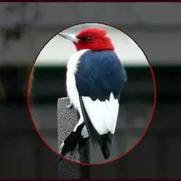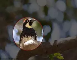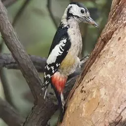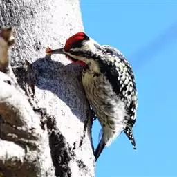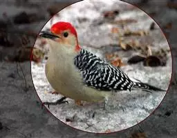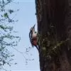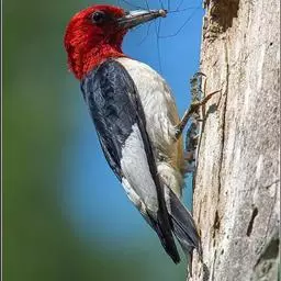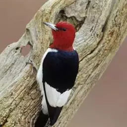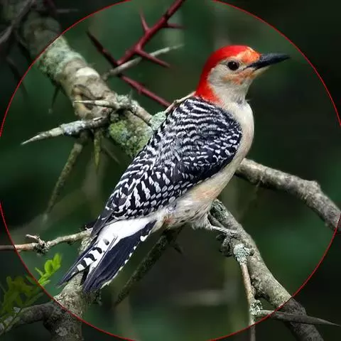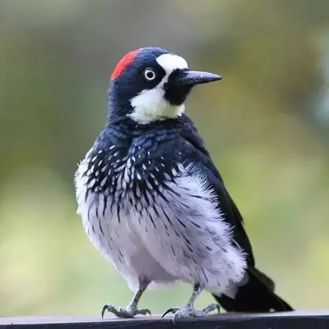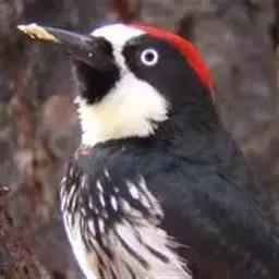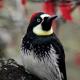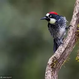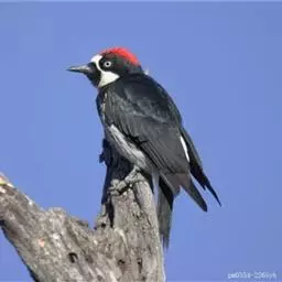 橡树啄木鸟:体长20-23厘米。前额灰黄色,头顶、后颈红色。喉下部、腰和腹部白色,…