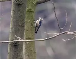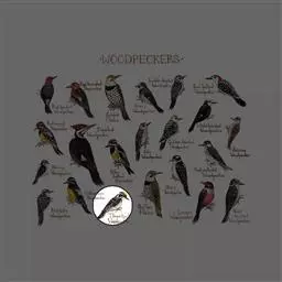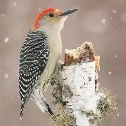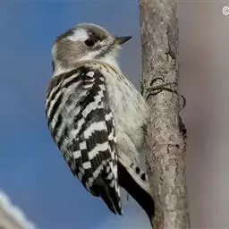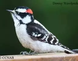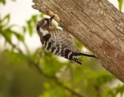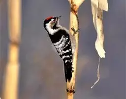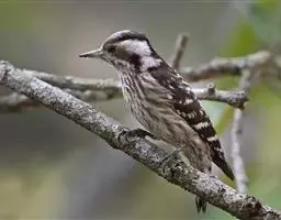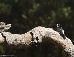 绒啄木鸟,北美洲最小的啄木鸟,白腹黑背和黑项,黑翼上有白色斑点。头部有黑白相间的条纹,尾巴短小,雄…