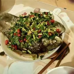 清蒸过江鱼是一道美食,由活鲤鱼、葱等原料做成。