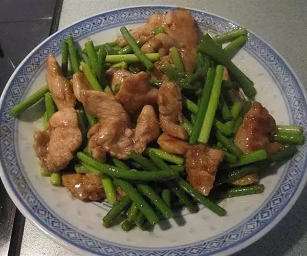 2、将油烧热,放入姜丝、蒜片,待爆出香味后,将肉丝倒入锅中加适量盐、煸炒至九成熟,盛起;