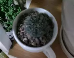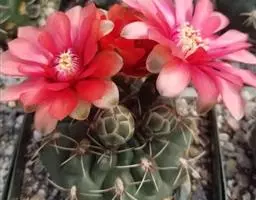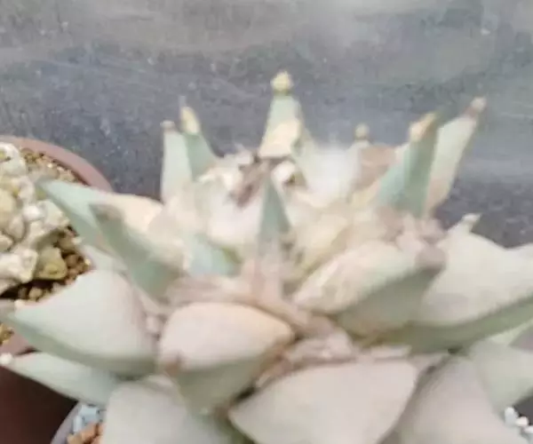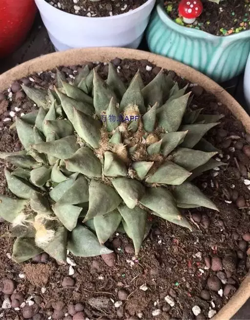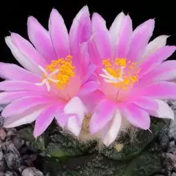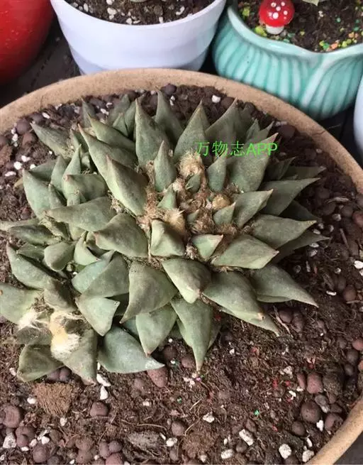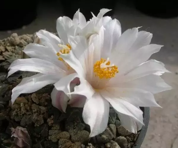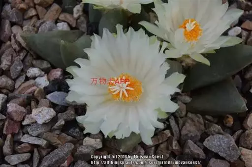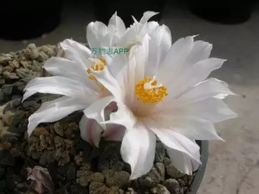 岩牡丹(Ariocarpus retusus) 原产地:墨西哥北部,是生长在亚热带的肉质仙人掌,岩牡丹半埋藏于土中,有着很大的主根。上部份扁平,直径为6-12厘米,有三角形的结节,重叠形成横向的皱纹。岩牡丹完全没有冠,及呈灰色,在其生长地很易收藏自己。岩牡丹顶有毛,生长几年后会长出粉红色或黄色的大花朵。岩牡丹含有苦味及有毒的生物碱,如大麦芽碱。这些生物碱可以保护植物本身免于草食性的动物所吃。