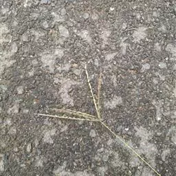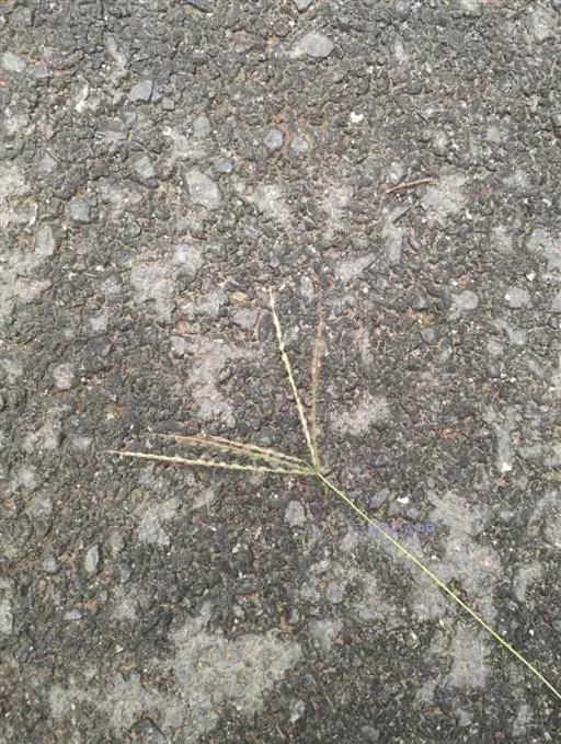 总状花序长5-10厘米,4至10枚呈指状排列于茎顶或散生于长2-4厘米的主轴上;穗轴宽0.5-0.8毫米,边缘微粗糙;小穗椭圆形,长1.5-1.8毫米,宽0.8-1毫米,2至3枚生于各节;小穗柄稍粗糙;第一颖不存在;第二颖稍短于小穗,具3脉,脉间及边缘生柔毛;第一外稃与小穗等长,有5-7脉,脉间及边缘生柔毛;毛壁有小疣突,中脉两侧无毛或毛较少,第二外稃与小穗近等长,中部宽约0.7毫米,顶端尖,有纵行颗粒状粗糙,紫褐色,革质,有光泽;花药长约0.5毫米。