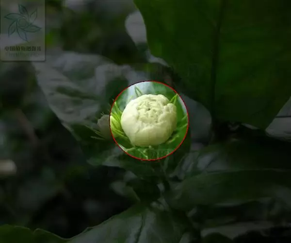 宝珠茉莉,圆叶对生,叶厚,花苞卵圆,似甘蓝,花开似荷花,一层一层展开,中心未展开的部分像一颗珠子,故得名宝珠茉莉。