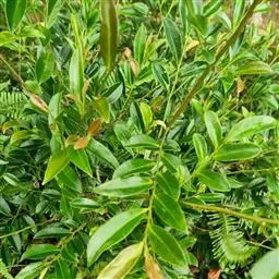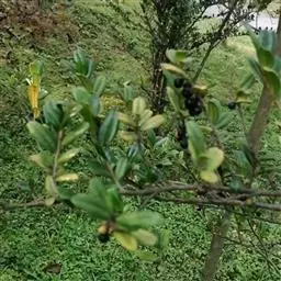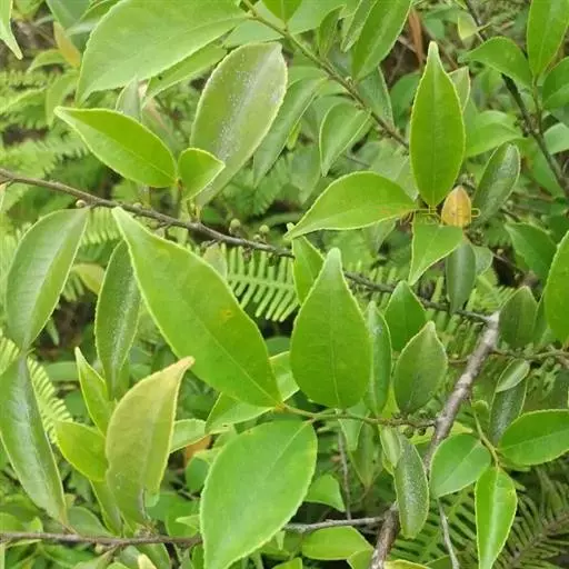 原生形态:灌木,高1-3m.嫩枝有棱,无毛或有疏毛。单叶互生;叶柄长2-5mm;叶片革质,成两列状,椭圆形至圆状披针形,长3-6cm,宽1.5-3cm,先端锐尖或渐尖,微凹,基部楔形,边缘具钝齿,上面深绿色,下面黄绿色,两面均无毛,主脉在上面下陷,侧脉不明显。花单性,雌雄异株,常1-3朵簇生于叶腋和枝侧;花梗短,下垂;萼片5,近圆形,宿存;花瓣5,白色或黄绿色,卵形,基部连合;雄花的雄蕊多数,短于花瓣,退化子房有或无;雌花无雄蕊,花柱短,先端3浅裂。浆果圆球形,径约5mm,成熟时紫黑色。花期8月底至12月底。