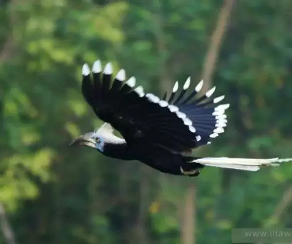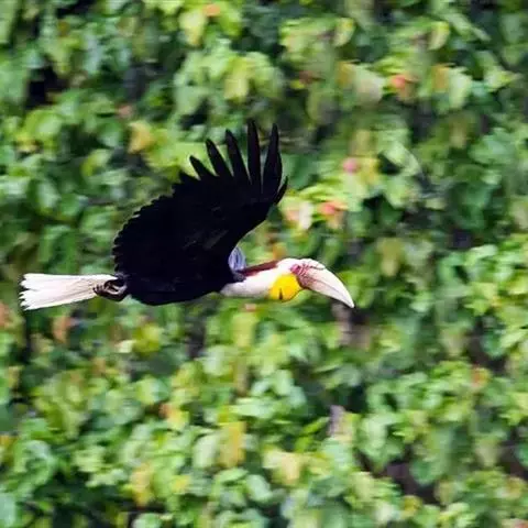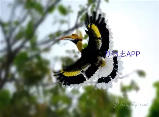 在西双版纳的密林中,身型庞大的犀鸟,飞行速度较慢,飞翔时翅膀发出极大的声响,就像天上过飞机一样,而且停落在树顶时,不时地发出响亮而粗历的鸣叫声,连续不断,能传出很远,如同马嘶一般。