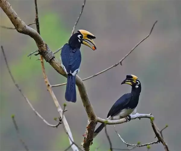 左图.冠斑犀鸟 右图双角犀鸟 因嘴呈象牙色,外形又像犀的角,故称为犀鸟。我国有4种:白喉小盔犀鸟(Ptilolaemus tickelli)、双角犀鸟(Buceros bicornis)、棕颈无盔犀鸟(Aceros nipalensis)和冠斑犀鸟(Anthracoceros coronatus)。冠斑犀鸟最为常见,体长约75~80厘米。背面羽毛纯黑,具有绿色金属光泽。翼缘、飞羽和尾羽先端白色。雄鸟嘴长大而下弯,约长15厘米,嘴上端的基部具有高大轻而坚固的盔突,雌鸟的盔突较小。嘴和盔突内为疏松的骨质纤维,故轻坚而灵巧。眼睑边缘有长形睫毛。常栖息于干燥森林中的巨木上,以果实、昆虫为食。在生殖季节,最为奇特的是雌鸟自选树洞,雄鸟衔泥等物在洞外协助封闭洞口,雌鸟在已封口的树洞内孵卵育雏;雄鸟担负在裂缝式的洞口处喂食。每窝孵卵2~4个,雌鸟直至雏鸟能出飞时方换羽外出。我国仅云南西部以及南部西双版纳和广西南部有此鸟。为留鸟。由于珍稀,所有种均被列为国家二级保护动物。