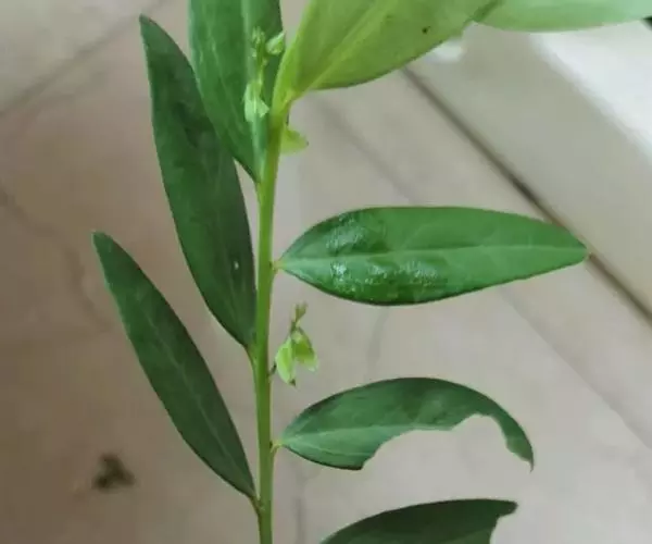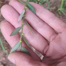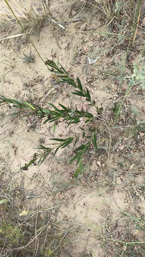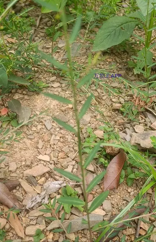 蜜甘草 一年生草本,高达60厘米;茎直立,常基部分枝,枝条细长;小枝具棱;全株无毛。叶片纸质,椭圆形至长圆形,长5-15毫米,宽3-6毫米,顶端急尖至钝,基部近圆,下面白绿色;侧脉每边5-6条;叶柄极短或几乎无叶柄;托叶卵状披针形。