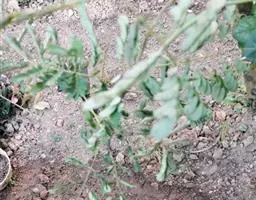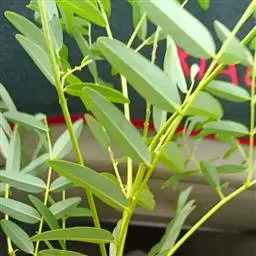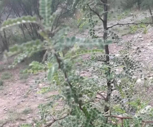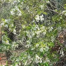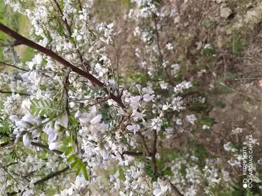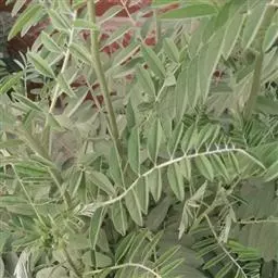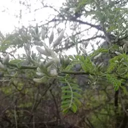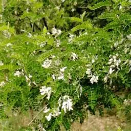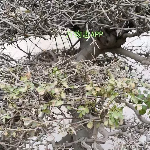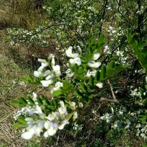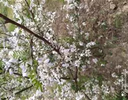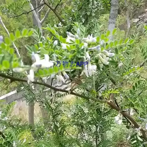 白刺花 灌木或小乔木,高1-2米,有时3-4米。枝多开展,小枝初被毛,旋即脱净,不育枝末端明显变成刺,有时分叉。羽状复叶;托叶钻状,部分变成刺,疏被短柔毛,宿存;小叶5-9对,形态多变,一般为椭圆状卵形或倒卵状长圆形,长10-15毫米,先端圆或微缺,常具芒尖,基部钝圆形,上面几无毛,下面中脉隆起,疏被长柔毛或近无毛。