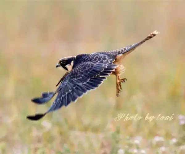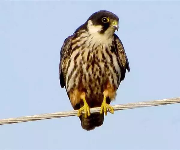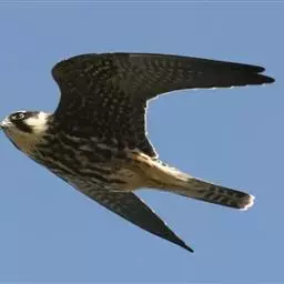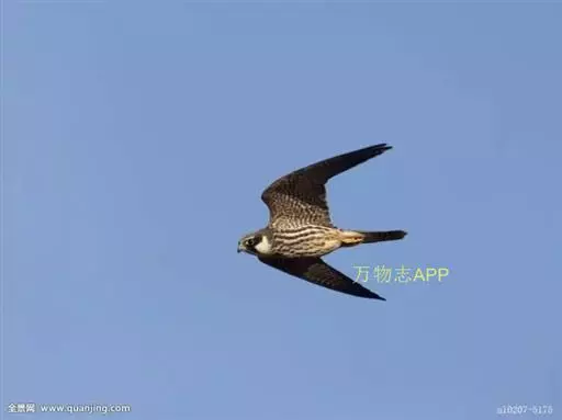 燕隼 燕隼俗称为青条子、蚂蚱鹰、青尖等,体形比猎隼、游隼等都小,为小型猛禽,体长28-35厘米,体重为120-294克。上体为暗蓝灰色,有一个细细的白色眉纹,颊部有一个垂直向下的黑色髭纹,颈部的侧面、喉部、胸部和腹部均为白色,胸部和腹还有黑色的纵纹,下腹部至尾下覆羽和覆腿羽为棕栗色。尾羽为灰色或石板褐色,除中央尾羽外,所有尾羽的内 均具有皮黄色、棕色或黑褐色的横斑和淡棕黄色的羽端。飞翔时翅膀狭长而尖,像镰刀一样,翼下为白色,密布游黑褐色的横斑。翅膀折合时,翅尖几乎到达尾羽的端部,看上去很象燕子,因而得名。虹膜黑褐色,眼周和蜡膜黄色,嘴蓝灰色,尖端黑色,脚、趾黄色,爪黑色。