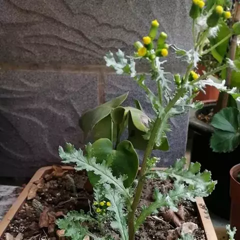 高50~80厘米,茎、枝均为绿色,有时略带紫晕,表面粗糙,残留有老叶脱落的鳞状物。肉质叶片倒卵形,青绿色,稍有白粉,叶缘及叶片基部均呈紫色,叶长4~6厘米,宽2~3厘米。头状花序高50~100厘米,小花群生,黄色或朱红色。
