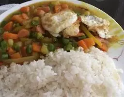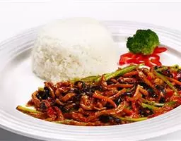 鸡胸肉、青笋、胡萝卜、大蒜、葱、干辣椒、盐、味精、胡椒粉、糖、醋、老抽、料酒、淀粉,热白饭一碗。