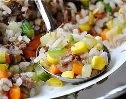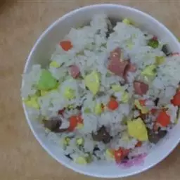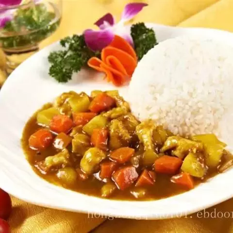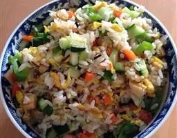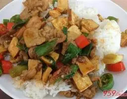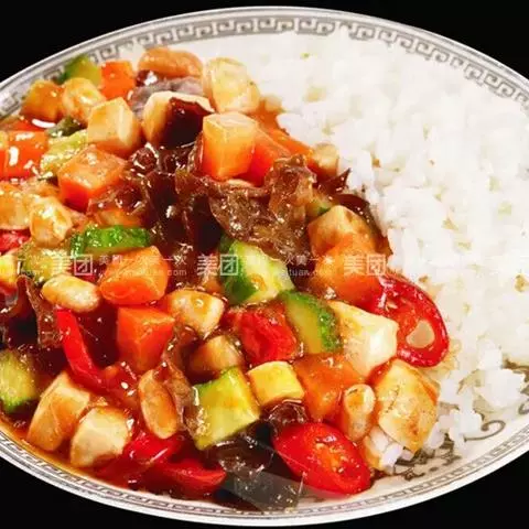 宫保鸡丁盖饭是一道简单的家常饭,主料是鸡胸肉、青笋、胡萝卜、大蒜、葱、干辣椒、盐、味精、胡椒粉、糖、醋、老抽、料酒、淀粉,热白饭一碗。