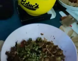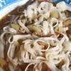 秘制炒卤:干煸羊肉,炒黑酱。精选山羊肉切丁备用,葱姜香料备用。油热,葱姜炸黄,煸炒羊肉30分钟左右,改小火加秘制黑酱翻炒10分钟。纯手工烩面,清汤煮面,煮熟后配以榨菜丁、虾米、秘制炒卤盛碗。面筋、味美,卤香四溢。