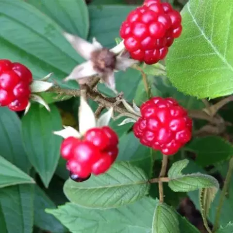 覆盆子为灌木,高1—2米;枝褐色或红褐色,幼时被绒毛状短柔毛,疏生皮刺。小叶3-7枚,长卵形或椭圆形,…