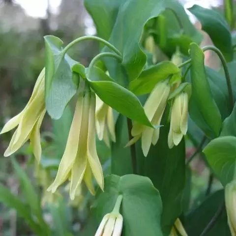 根状茎短;根较细而质硬。茎高25-60厘米,不分枝或上部分枝。叶纸质或厚纸质,椭圆形至卵形,长2-5厘米,宽1-3厘米,先端急尖或有小尖头,基部圆形,下面脉上和边缘稍粗糙。伞形花序有花2-6朵,通常生于茎和分枝的顶端;花梗长1-2厘米,下弯,有棱和乳头状突起;花被片绿黄色,倒卵形或矩圆形,长7-13毫米,宽3-4毫米,有棕色腺点和微毛,先端尖或微凹,边缘有乳头状突起,基部具长0.5-1毫米的短距;雄蕊内藏,花药长3-4毫米,花丝短于或等长于花药;子房倒卵形,长约2.5毫米;花柱长3-5毫米,柱头3裂,扁平,有乳头状突起。浆果直径6-9毫米。种子褐色,直径2-3毫米。花期5-7月,果期8-10月。