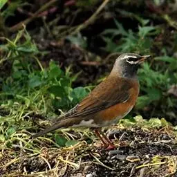 灰头鸫(学名:Turdus rubrocanus):中型鸟类,体长23-27厘米。整个头、颈和上胸褐灰色,两翅和尾黑色,上、下体羽栗棕色。颏灰白色,尾下覆羽黑色具白色羽轴纹和端斑。嘴、脚黄色。