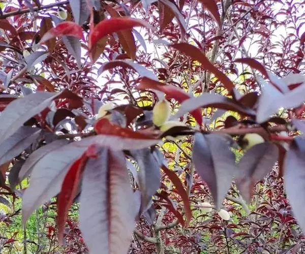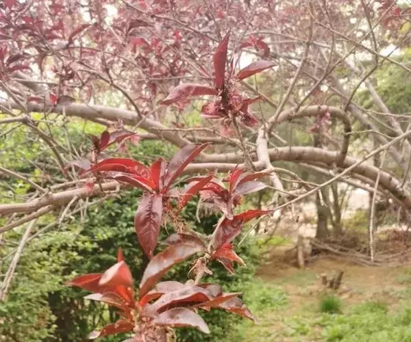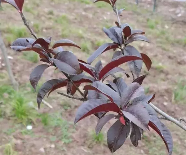 叶长卵形或卵状长椭圆形,长4-8厘米,先端渐尖,叶基部广楔形,叶缘有不整齐的细钝齿,叶面红色或紫色,背面色彩更红,新叶顶端鲜紫红色,当年生枝条木质部红色。花单生,中等偏小,淡粉红色,花瓣5片,微香,雄蕊多数,单雌蕊,花期4-5月。