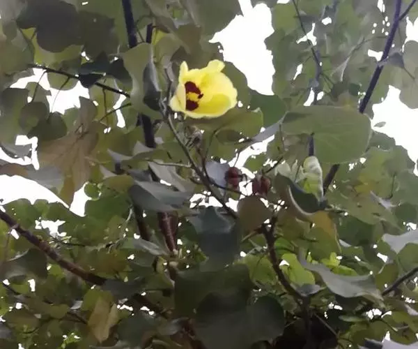 黄槿(学名:Hibiscus tiliaceus Linn.)是锦葵科木槿属植物,常绿灌木或乔木,高4-10米,胸径粗达60厘米;树皮灰白色;小枝无毛或近于无毛,很少被星状绒毛或星状柔毛。叶革质,近圆形或广卵形,直径8-15厘米,先端突尖。花序顶生或腋生,常数花排列成聚散花序,总花梗长4-5厘米,花梗长1-3厘米,基部有一对托叶状苞片。蒴果卵圆形,长约2厘米,被绒毛,果爿5,木质;种子光滑,肾形。花期6-8月。