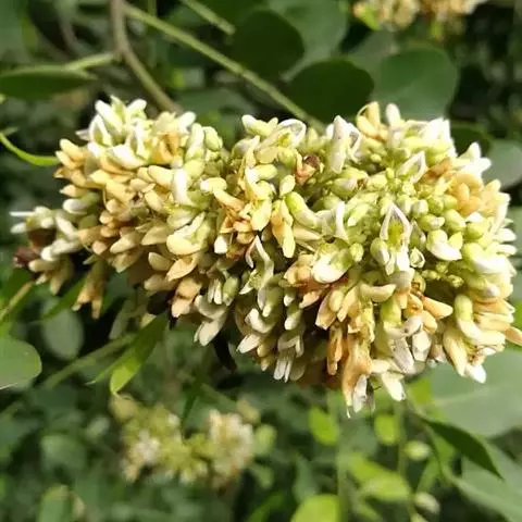 圆锥花序腋生,比复叶短,长1.5-5厘米,分枝聚伞花序状;总花梗、花序轴、分枝与花梗均被柔毛;花小,稍密集,长约5毫米;小苞片卵形,被柔毛,脱落;花萼钟状,略被毛,萼齿除下方1枚较长,为披针形之外,其余的卵形,均具缘毛;花冠白色或淡黄色,花瓣具短柄,旗瓣长圆状倒卵形,先端微凹缺,翼瓣倒卵状长圆形,龙骨瓣椭圆形;雄蕊9,偶有10枚,单体,花丝长短相间;子房具柄,沿腹缝线疏被柔毛,其余无毛,花柱短,柱头小,有胚珠2-3粒。