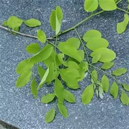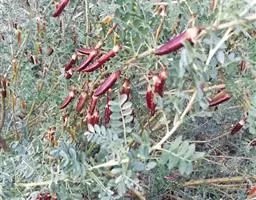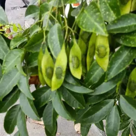 荚果无毛,长圆形至带状,扁平,长3-6厘米,宽1-2厘米,顶端急尖,基部钝或楔形,具稍长的果颈,果瓣革质,对种子部分有网纹,有种子1 (-2)粒;种子肾形,扁平,长约10毫米,宽约6毫米。花期4-5月。