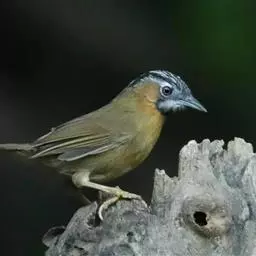 黑顶噪鹛:中型鸟类,体长24-26厘米。前额、脸、颏、喉黑色,头顶黑褐沾棕或深棕橄榄褐色,…