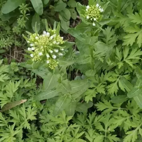 总状花序顶生,花多数;萼片长卵形,长2-3毫米,宽约1毫米,边缘膜质,基部略呈囊状;花瓣白色,倒卵形或宽是形,具脉纹,长3-4毫米,宽1-1.5毫米,顶端圆,基部渐狭成细爪。