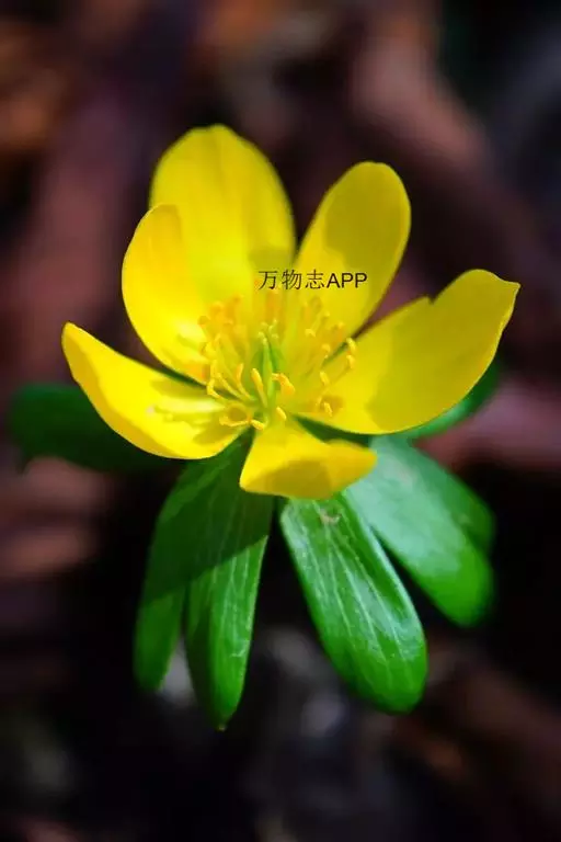 根状茎球形,直径8-11毫米。基生叶1或不存在,小,长约6厘米,有长柄,无毛;叶片圆肾形,长约6毫米,宽约1厘米,三全裂高达20厘米,无毛;苞片在开花时尚未完全展开,花谢后长达2.5-3.5厘米,深裂成披针形或线状披针形的小裂片,无毛;花梗长4-10毫米,果期增长到2.5厘米,通常有开展的短柔毛;花直径1.6-2厘米;萼片黄色,狭卵形或长圆形,长7-10毫米,宽2.2-5毫米,顶端微钝,无毛;花瓣约10,长3.5-5毫米,漏斗形,基部渐狭成短柄,上部二叉状;雄蕊长5-7毫米,无毛,花药长约1.2毫米;心皮6-9,与雄蕊近等长,子房通常有短毛。蓇葖果星状展开,长约15毫米,有短柔毛,喙细,长约3毫米,心皮柄长约2毫米;种子暗紫色,近球形,直径约1.6毫米,种皮表面有皱纹。3-4月开花,5月结果 。