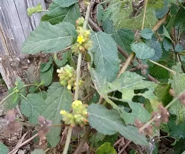 亚灌木;嫩枝被灰褐色短茸毛。叶纸质,生于茎下部的阔卵圆形,长3-8厘米,宽2-6厘米,先端常3裂,基部圆形;生于上部的长圆形;上面有疏毛,下面有星状柔毛,基出脉3-5条,两侧脉直达裂片尖端,边缘有不规则的粗锯齿;叶柄长1-5厘米。聚伞花序数枝腋生,花序柄及花柄均极短;萼片狭长圆形,长5毫米,顶端有角,被长毛;花瓣比萼片略短,黄色,边缘有毛;雄蕊10枚;子房有刺毛。果球形,不开裂,被灰黄色柔毛,具勾针刺长2毫米,有种子2-6颗。花期夏秋季间。