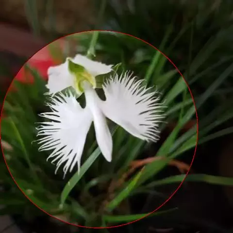 花葶长10-12厘米,明显长于叶,中下部有2-3枚筒状鞘;花苞片膜质,披针形,长1.5-1.8厘米,下部圆筒状并围抱花梗和子房;花梗和子房纤细,长1.7-2厘米;花单朵,直径3-4厘米;萼片与花瓣相似,向后伸展,线状披针形,长1.4-1.8厘米,宽1.5-2毫米,先端渐尖;唇瓣扁囊状(上下压扁),3裂;侧裂片半圆形,近直立,长3-4毫米,宽5-6毫米;中裂片扩大,向前延伸,呈铲状,长8-10毫米,基部有髯毛3束或更多;囊向前延伸,长2-2.3厘米,宽约1厘米,有紫色粗斑纹,末端呈双角状;蕊柱长8-10毫米,两侧有宽翅,全宽约1厘米,倾覆于囊口。花期4-6月。