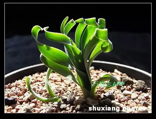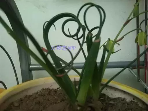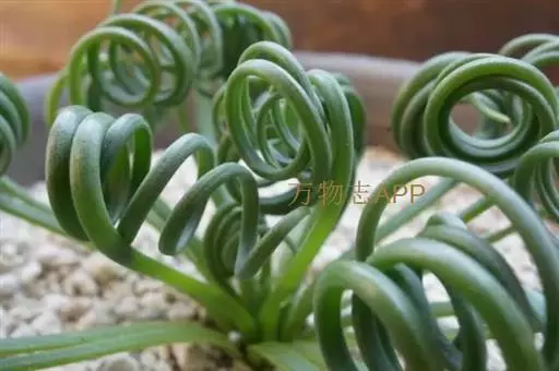 肉质叶由鳞茎顶部长出,线形,先端变细,表面光滑或有白色毛刺,叶先直立生长,后逐渐扭曲盘旋,致使叶前端呈弹簧状。