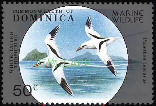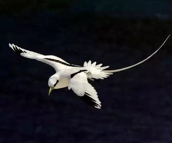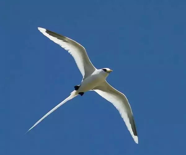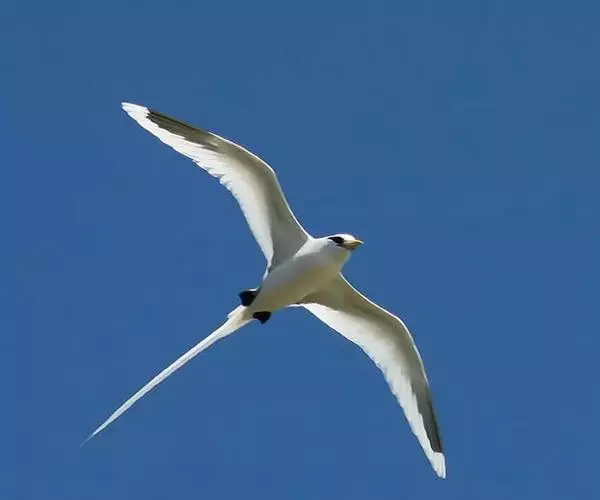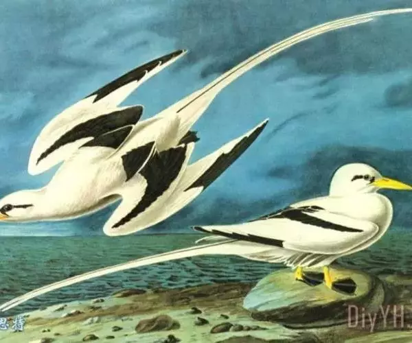 白尾鹲(学名:Phaethon lepturus):体重220-410克;体长370-400毫米,加上延长的尾羽为680-990毫米,是一种中型热带海鸟。全身羽毛主要为白色,繁殖期微缀有橙色。眼前和眼后有粗著的黑色斑,像两条粗黑的眼眉。翅基部和两胁亦有黑色,飞翔时可明显看见翼上两条黑色斜线。中央两枚尾羽特别长,白色。虹膜褐色;嘴橘黄或黄色,经过鼻孔有一条黑线,跗蹠黄色,趾和蹼黑色。