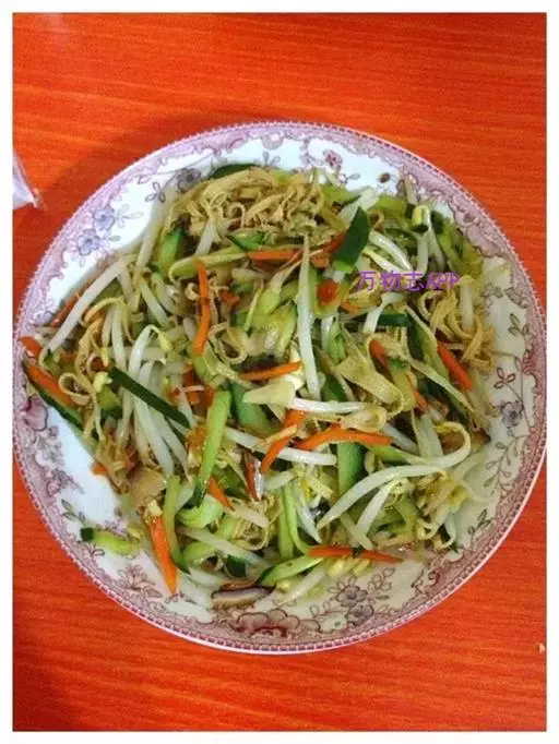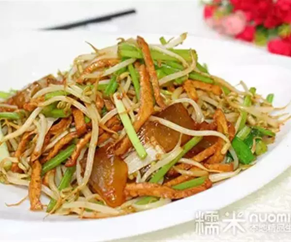 8. 另起一勺,放葱油少许,放掐头去尾的豆芽菜,旺火急炒,随放盐及醋适量,以除其豆生味;