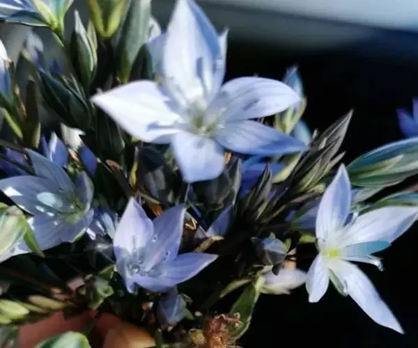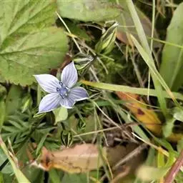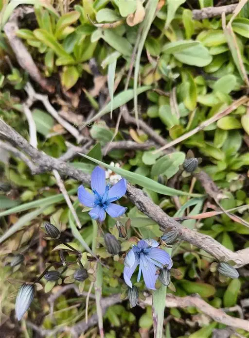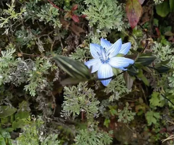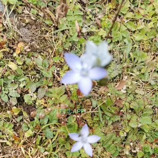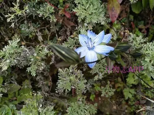 辐状肋柱花,又名辐花侧蕊。一年生草本,高15-40厘米。茎不分枝或自基部有少数分枝,近四棱形,直立,绿色或常带紫色。叶无柄,狭长披针形、披针形至线形,长至43毫米,宽1.5-4毫米,枝及上部叶较小,先端急尖,基部钝,半抱茎,中脉在两面明显。花5数,顶生和腋生,直径2-3厘米,花梗直立或斜伸,四棱形,不等长,长至8厘米;花萼较花冠稍短或等长,裂片线形或线状披针形,稍不整齐,长8-22(27)毫米,先端急尖,花冠淡蓝色,具深色脉纹,裂片椭圆状披针形或椭圆形,一般长1.5-2.5厘米,先端钝或急尖,基部两侧各具1个腺窝,腺窝管形,边缘具不整齐的裂片状流苏;花丝线形,长6-8毫米,花药蓝色,狭矩圆形,长3-4.5毫米;子房无柄,长12-14毫米,柱头小,三角形,下延至子房下部。蒴果狭椭圆形或倒披针状椭圆形,与花冠等长或稍长;种子淡褐色,圆球形,直径0.3-0.4毫米,光滑。染色体2n=10。花果期8-9月。