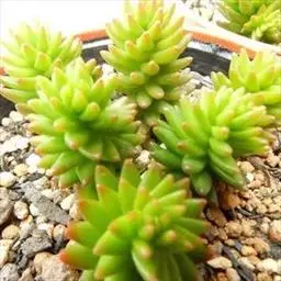 玉米石是景天科、景天属植物。多年生草本多浆植物。植株低矮丛生,多分枝。叶膨大成圆筒形、卵形或近小球形,…