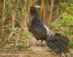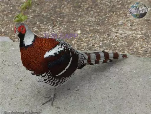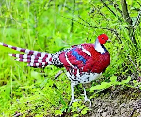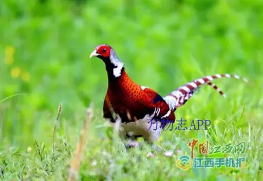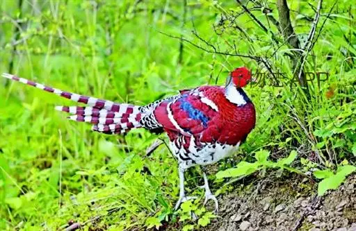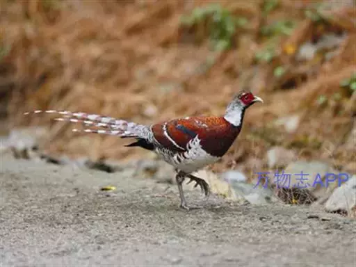 白颈长尾雉(学名:Syrmaticus ellioti):大型鸡类,体长81厘米,体型大小和雉鸡相似。雄鸟头灰褐色,颈白色,脸鲜红色,其上后缘有一显著白纹,上背、胸和两翅栗色,上背和翅上均具1条宽阔的白色带,极为醒目;下背和腰黑色而具白斑;腹白色,尾灰色而具宽阔栗斑。雌鸟体羽大都棕褐色,上体满杂以黑色斑,背具白色矢状斑;喉和前颈黑色,腹棕白色,外侧尾羽大都栗色。