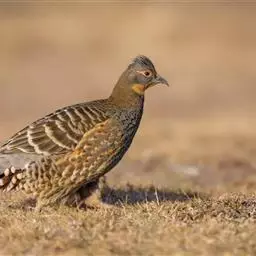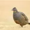 体大的灰褐色鹑类。胸灰色具黑色细纹。与相似种类四川雉鹑不同处在于栗色喉块外缘近白。有猩红色眼周裸皮。…