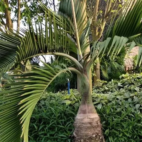 羽状叶,拱形,旋转,整齐排列成2列,在基部侧向扭转而使羽片叶面与叶轴所在平面成45°,形成优美的叶冠茎,特别是其茎干光滑而中下部膨大,形似酒瓶,更具观赏价值。不论室内盆栽,还是庭院栽培都是优良的观赏绿化树种。