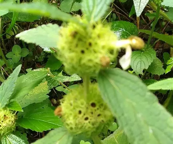 草本,从纤细须根伸出,高30-80cm,有时至1m。茎直立,或上部多扭曲,纤弱,通常在上部分枝,偶有自基部分枝,钝四棱形,微具沟槽,密被贴生或倒向的金黄色长硬毛,有时在茎基部毛被略脱落。叶卵状披针形或披针形,长6-9cm,宽1-3cm,先端锐尖,基部宽楔形至近圆形,有远离的浅锯齿,纸质,上面绿色,下面淡绿色,上面贴生浅黄色短柔毛,下面沿脉上密被短柔毛,余部疏被微柔毛,明显密布淡黄色腺点,侧脉3-5对,在上面微凹陷,下面稍突出;叶柄长0.6-1cm,密生金黄色长硬毛。轮伞花序腋生,少数而远离地着生于枝条的先端,球形,径1.5-2.5cm,多花密集,其下承以多数密集苞片;苞片线形,与尊筒等长或比萼筒长,边缘较薄,上面及边缘上具淡黄色长硬毛,下面无毛。花萼管状,长约1cm,先端膨大而略折曲,外面有刚毛,下部毛被稀疏或近于无毛,上部密集,内面在口部密生柔毛,脉10,明显,齿10,刺状,从截平而略偏斜的萼口突然伸长,在果时呈星状开张,长约3mm,外被长硬毛。花冠白色或紫色,长约2.8cm,冠筒长约1cm,与萼筒等长或略伸出于萼筒,外面近喉部具微柔毛,余部均无毛,内面在中部以下具略偏斜的须毛状毛环,冠檐二唇形,上唇直仲,盔状,长圆形,外面密被金黄色长柔毛,内面无毛,下唇较上唇长1.5倍,平展,3裂,中裂片倒梯形,先端2圆裂,侧裂片卵圆形。雄蕊4,内藏,前对较长,花丝丝状,花药卵圆形,2室,室极叉开。花柱丝状,略与雄蕊等长,先端极不等2裂。花盘平顶,波状。子房无毛。小坚果卵珠形,褐色。花期7-10月,果期10-11月。