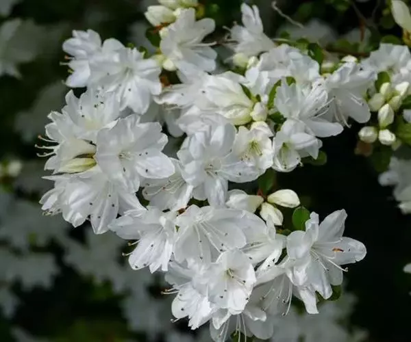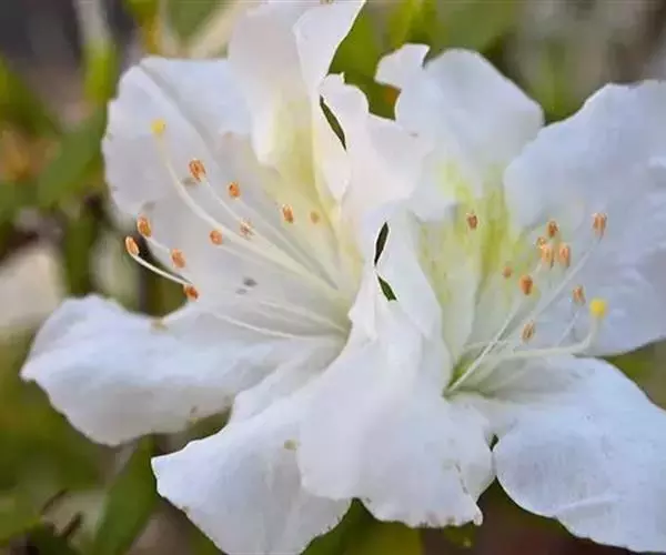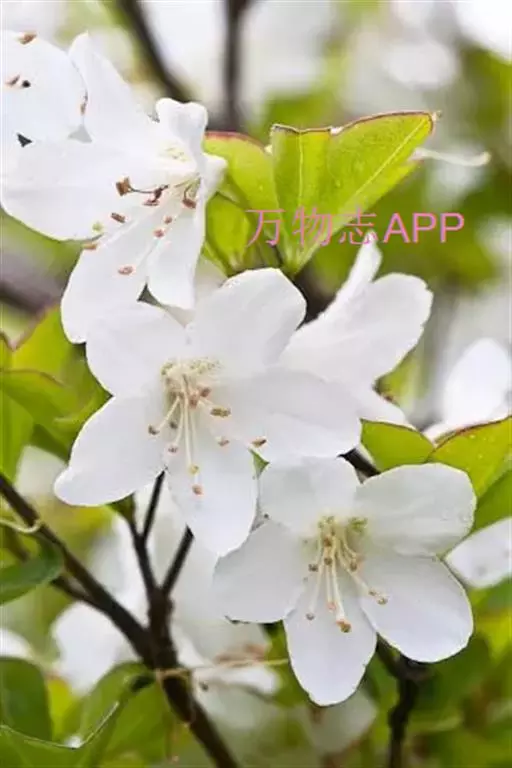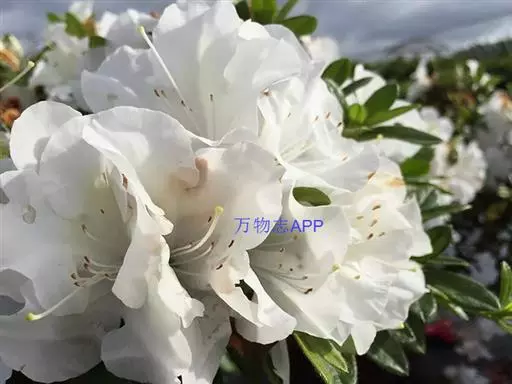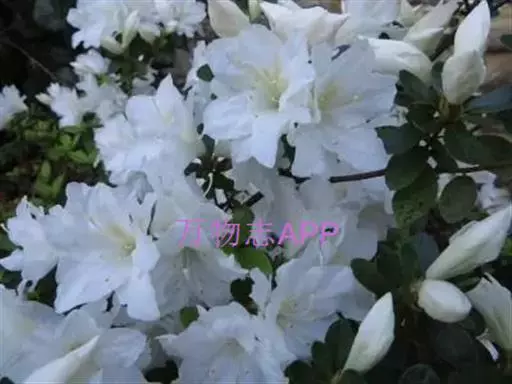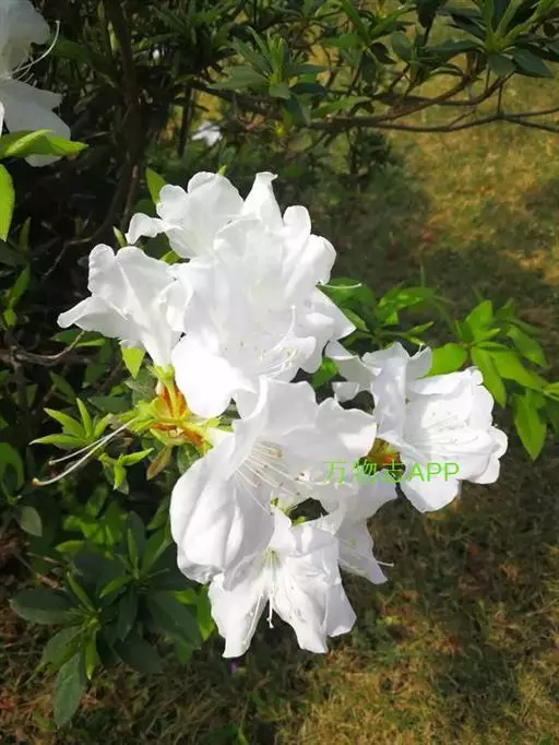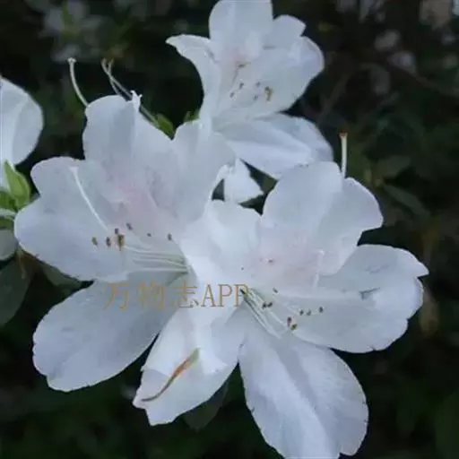 白花杜鹃(学名:Rhododendron mucronatum (Blume) G. Don ):半常绿灌木,高1-2米;幼枝开展,分枝多。叶纸质,披针形至卵状披针形或长圆状披针形,上面深绿色,混生短腺毛。伞形花序顶生,具花1-3朵;花冠白色,有时淡红色,阔漏斗形。蒴果圆锥状卵球形,长约1厘米。花期4-5月,果期6-7月。