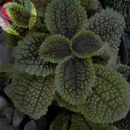 多年生常绿草本植物。株高20-60厘米左右。具有不规则的偏圆形块茎,周围长有网状须根。地上茎肉质,多分枝,叶呈不规则心形、先端锐尖,基部偏斜,边缘齿状。茎秆、叶柄及叶面有纤毛。