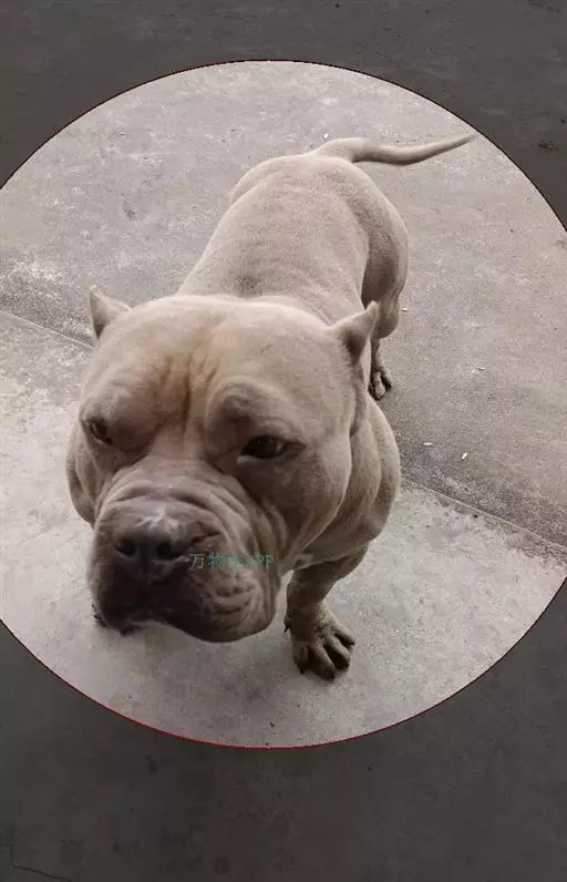 从上向下俯视美国恶霸犬的头部,是一个非常接近圆形的椭圆形,这更加说明他宽阔的头盖骨是它一个明显的头部特征。