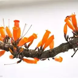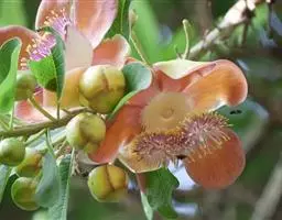 圆锥花序生于小枝顶端,花序轴下垂,长50-100厘米;花稀疏,6-10朵。花萼钟状,革质,长4.5-5厘米,直径约2厘米,3-5裂齿不等大,顶端渐尖。花冠桔黄色或褐红色,裂片卵圆形,上唇2片较小,下唇3片较大,开展,花冠筒外面具凸起纵肋。雄蕊4,2强,外露,花药个字形着生,药室2,纵裂。花盘环状。柱头2裂,子房1室,胚珠多数。果下垂,圆柱形,长38厘米左右,直径12-15厘米,坚硬,肥硕,不开裂,果柄长8厘米。种子多数,无翅,镶于木质的果肉内。