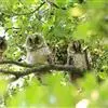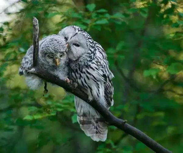雏鸟 灰林鸮的繁殖期在1月至翌年4月。主要营巢于树洞中,有时也在岩石下面的地上营巢或利用鸦类巢。每窝产卵1-8枚,通常2-4枚。卵的大小为46-49mm×39-42mm。雌鸟孵卵,孵化期28-30天。雏鸟晚成性,经过亲鸟29-37天的喂养才能飞翔。雏鸟会于长羽毛前离开鸟巢。雏鸟的生存率不明,但成年每年的生存率为76.8%。灰林鸮一般寿命约为5年,但亦曾发现有分别超过18岁及27岁的野生及饲养灰林鸮。